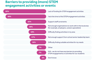 Funding (52%), and time (49%) were the main barriers, while just over a fifth (22%) said staff resources were a barrier. In total, 79% highlighted one or more of these as a STEM outreach barrier.