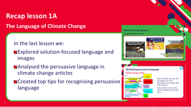 This is English lesson 1B of the Climate Schools Programme. In these lessons the subject of climate change is a lens to explore communication, persuasive language and debate. Young people will engage with a lot of information on climate change. This lesson supports you to help them to understand the topic, analyse it and reach conclusions. These lessons do not require a scientific understanding of climate change and focus on English language techniques.