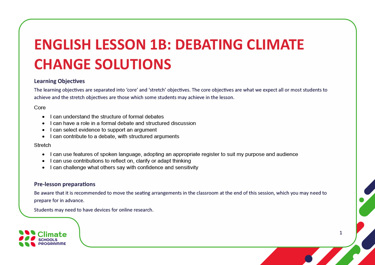 This is English lesson 1B of the Climate Schools Programme. In these lessons the subject of climate change is a lens to explore communication, persuasive language and debate. Young people will engage with a lot of information on climate change. This lesson supports you to help them to understand the topic, analyse it and reach conclusions. These lessons do not require a scientific understanding of climate change and focus on English language techniques.