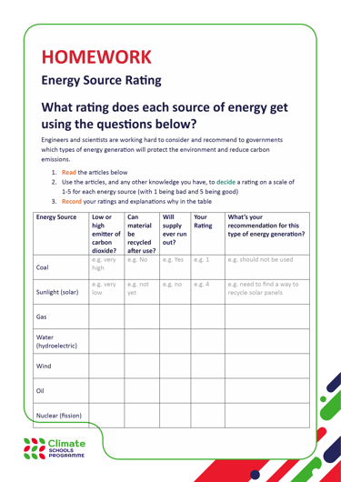 - Climate Schools Programme geography homework - Energy source rating
