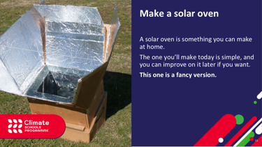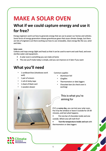 Introduce your students to the Climate Schools Programme with our science taster session. This activity explores renewable energy and students create a solar oven.