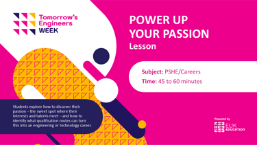 Tomorrow’s Engineers Week 2024, from EngineeringUK, is a yearly series of events and activities for schools across the UK. This Power up your passion assembly is designed to inspire students with ideas for how to discover their passion – the sweet spot where their interests and talents meet – and how to identify what activities and qualification routes can turn this into an engineering or technology career. A follow-on lesson helps students to plan how they can apply curiosity, creativity and persistence to move forward in their learning and get ready for their career.