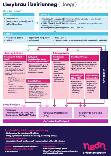 Career route map for England (Welsh language version). There are many career pathways into engineering and technology for young people in England. From GCSEs, BTECs and A levels to apprenticeships, higher education and T Levels.