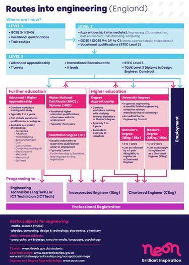 There are many career pathways into engineering and technology for young people in England. From GCSEs, BTECs and A levels to apprenticeships, higher education and T Levels. Make the process of deciding next steps easier with our bright and colourful route map. It shows in detail the possible routes into an engineering/technology career, through education and training in England.