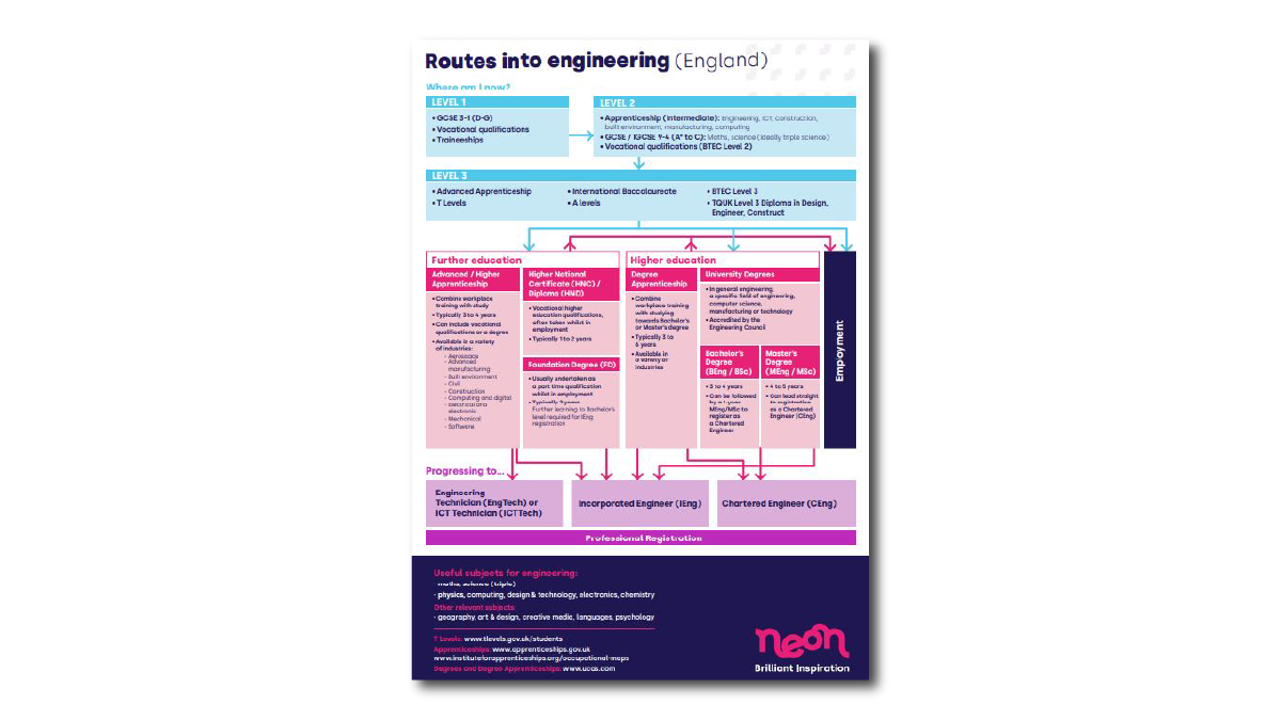 Career pathways for students in Wales include qualifications like GCSEs, Engineering Learning Programme, WJEC Vocational Awards, A levels, apprenticeships and university degrees. Make the process of deciding next steps easier with our bright and colourful route map. It shows in detail the possible routes into an engineering/technology career, through education and training in Wales.