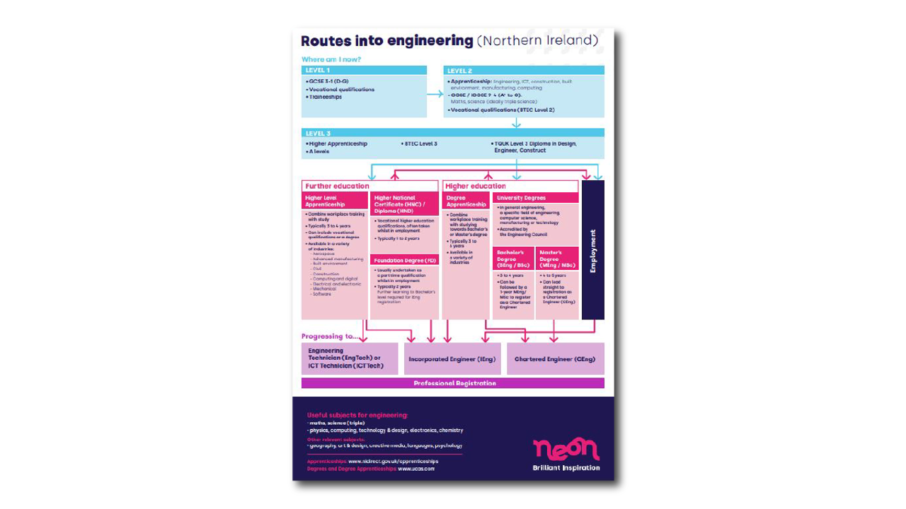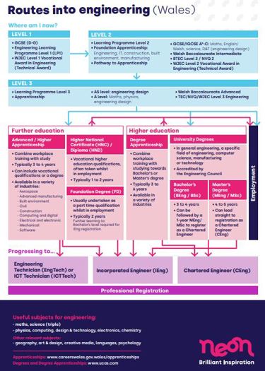 Career pathways for students in Wales include qualifications like GCSEs, Engineering Learning Programme, WJEC Vocational Awards, A levels, apprenticeships and university degrees. Make the process of deciding next steps easier with our bright and colourful route map. It shows in detail the possible routes into an engineering/technology career, through education and training in Wales.
