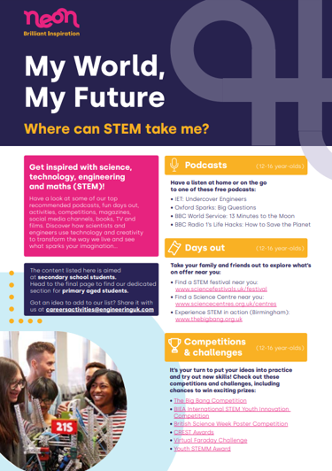 Discover suggested STEM inspiration and career resources to explore at home, including podcasts, competitions and days out. This resource is also great to share with parents to support them at home.