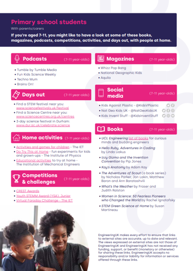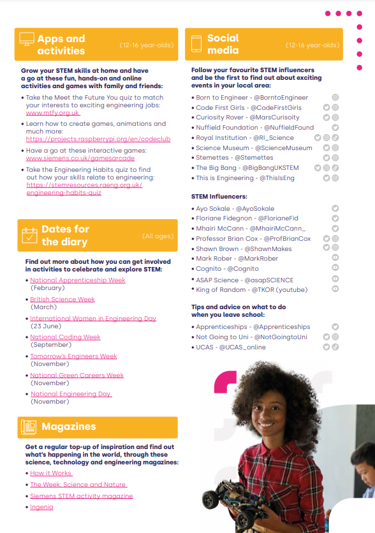 Discover suggested STEM inspiration and career resources to explore at home, including podcasts, competitions and days out. This resource is also great to share with parents to support them at home.